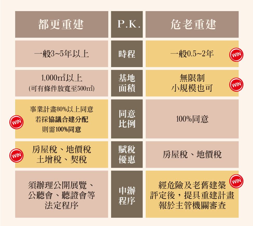 ※「民辦都更」:則是地主出地、建商出資一起興建房屋,更新後依比例分回土地與房屋。